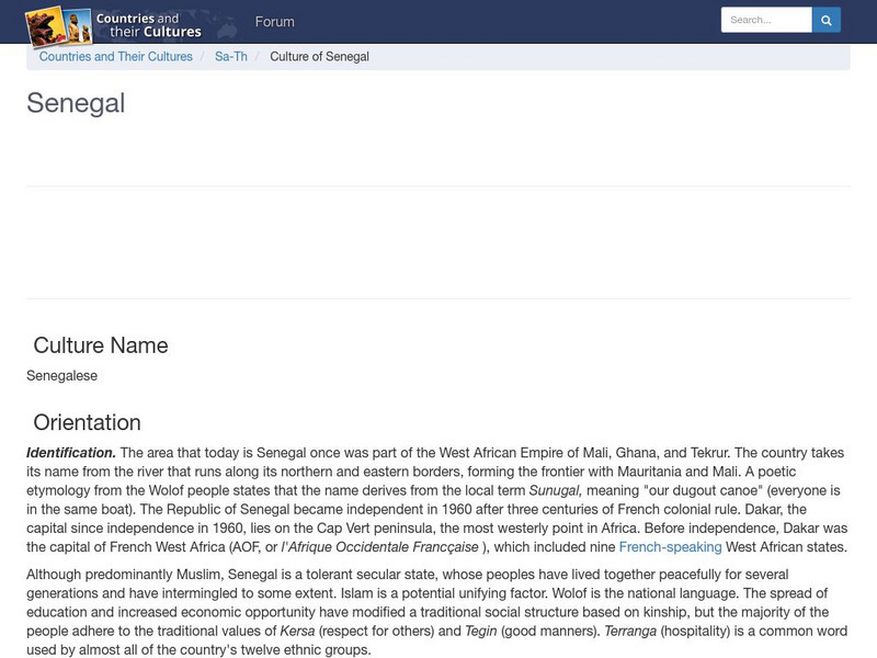Provides an overview of the culture of Senegal. Gives basic information on topics such as geography, ethnic makeup, languages, symbolism, economy, food, customs, social stratification, family life, education, religion, politics, etc....