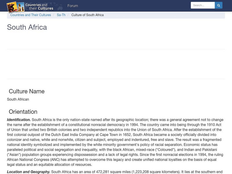 Provides an overview of the culture of South Africa. Gives basic information on topics such as geography, ethnic makeup, languages, symbolism, economy, food, customs, social stratification, family life, education, religion, politics,...