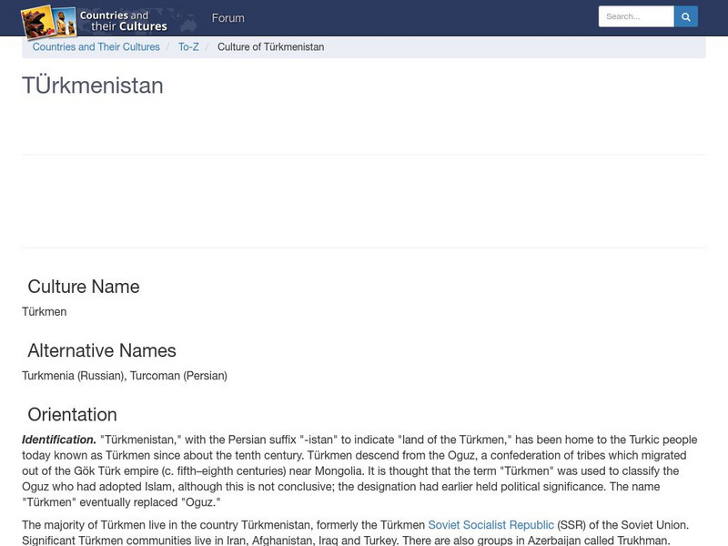 Provides an overview of the culture of Turkmenistan. Gives basic information on topics such as geography, ethnic makeup, languages, symbolism, economy, food, customs, social stratification, family life, education, religion, politics,...