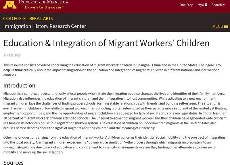 This resource consists of videos concerning the education of migrant workers' children in Shanghai, China, and in the United States. Their goal is to help us think critically about the impact of migration on the education and integration...