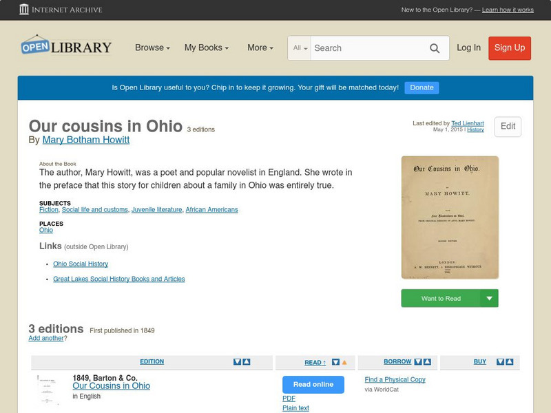 This ebook version of Mary Botham Howitt's "Our Cousins In Ohio" has been made available in multiple formats by the Open Library. Editions of the full novel, organized by year of publication, may be accessed here.