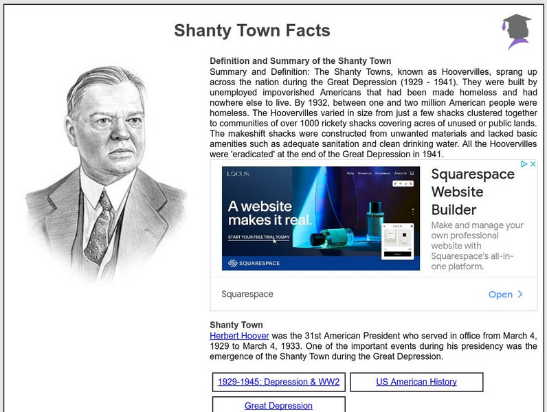 Facts on Shanty Towns (Hoovervilles)that were makeshift camps set up by the homeless during the Depression.