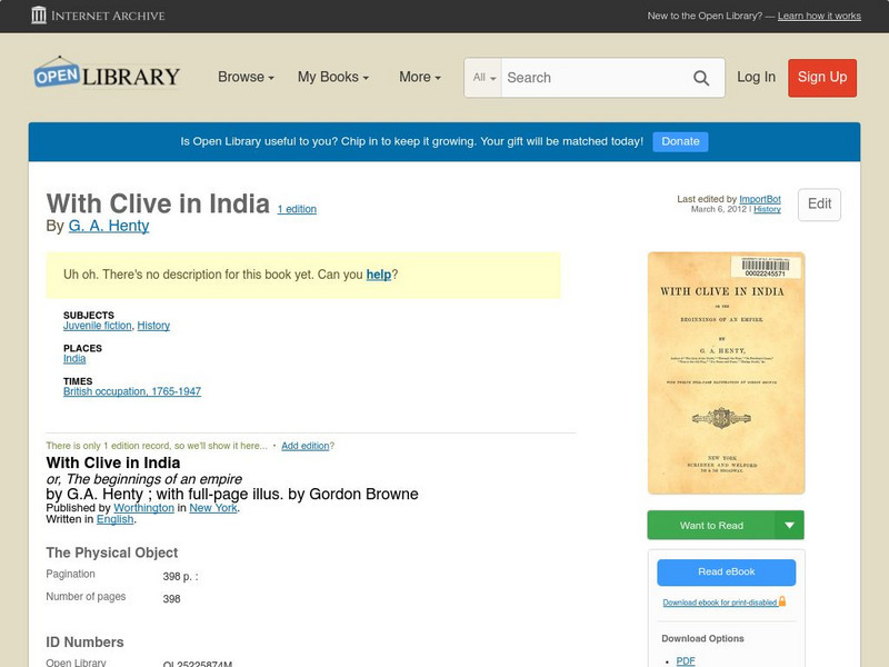 This ebook version of G. A. Henty's With Clive In India has been made available in multiple formats by the Open Library. Editions of the full novel, organized by year of publication, may be accessed here.