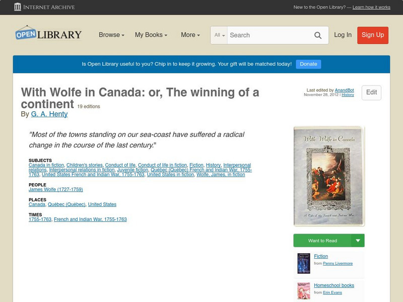 This ebook version of G. A. Henty's With Wolfe In Canada has been made available in multiple formats by the Open Library. Editions of the full novel, organized by year of publication, may be accessed here.