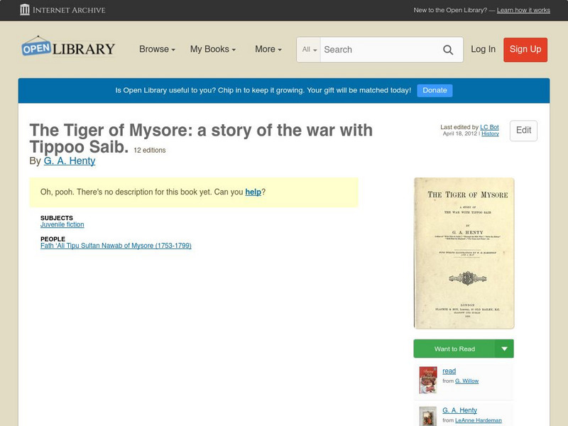 Open Library: The Tiger of Mysore: A Story of the War With Tippoo Saib.
