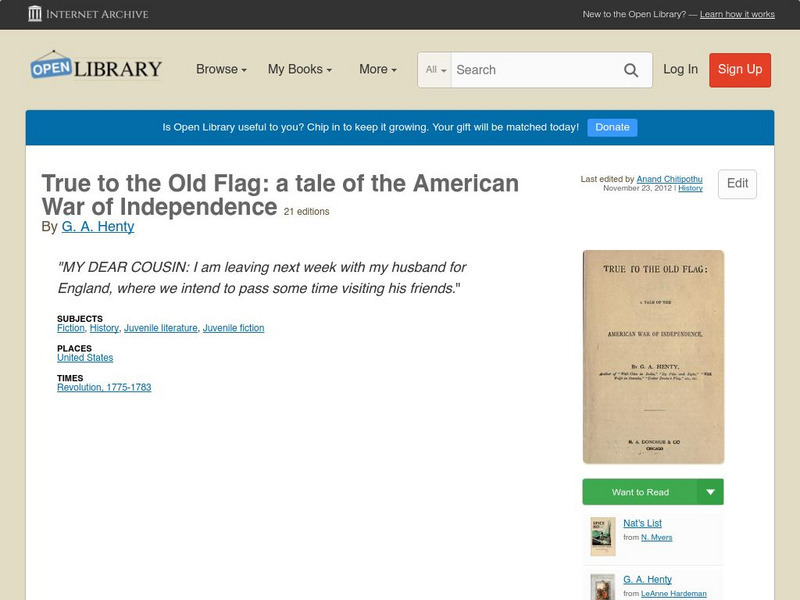 This ebook version of G. A. Henty's True To The Old Flag: A Tale Of The American War Of Independence has been made available in multiple formats by the Open Library. Editions of the full novel, organized by year of publication, may be...