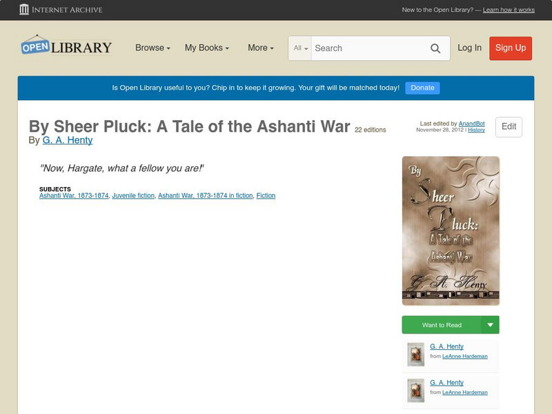 This ebook version of G. A. Henty's By Sheer Pluck: A Tale Of The Ashanti War has been made available in multiple formats by the Open Library. Editions of the full novel, organized by year of publication, may be accessed here.