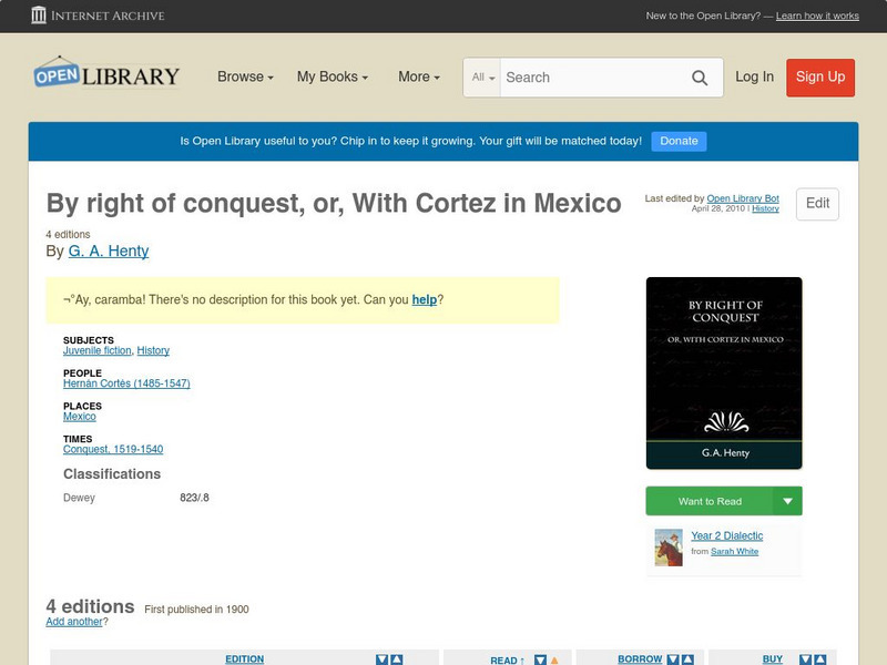 This ebook version of G. A. Henty's By Right Of Conquest, Or, With Cortez In Mexico has been made available in multiple formats by the Open Library. Editions of the full novel, organized by year of publication, may be accessed here.