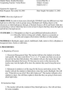 Second graders investigate how light passes through objects, is blocked, bounces off of things, and bends. They discuss how light moves in different ways, and with a partner walk around the room with a flashlight, shining the light on...