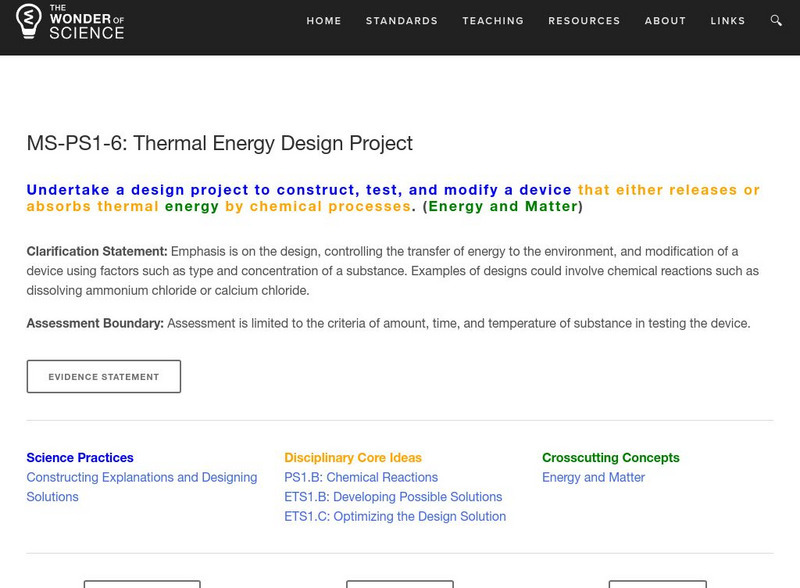 A collection of lessons that have students completing a design project where they construct, test, and modify a device that uses chemical processes to either release or absorb thermal energy. Site includes work samples, phenomena,...