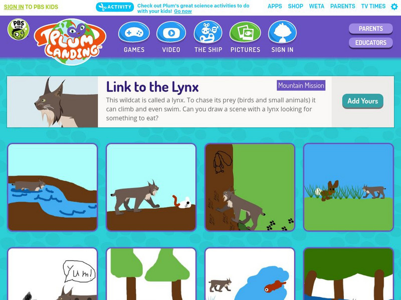 This PBS Kids activity is an extension of a Plum Landing episode featuring the lynx. Students will learn basic information about the lynx; students will also use online drawing tools to design a scene with a lynx hunting for food.