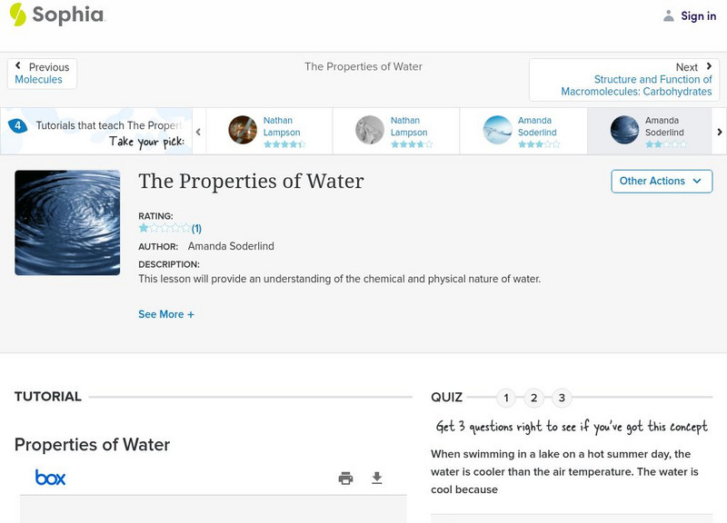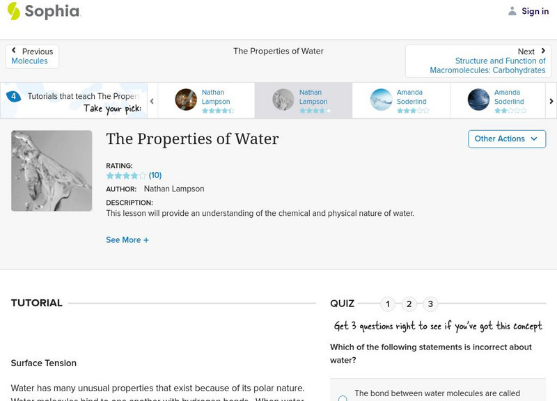 This lesson will provide an understanding of the chemical and physical nature of water. It is 1 of 4 in the series titled "The Properties of Water."