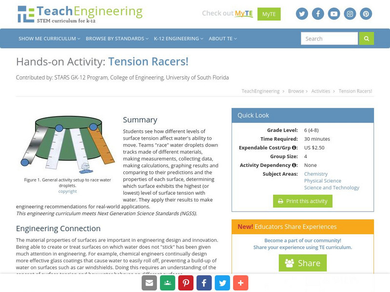 Students see how different levels of surface tension affect water's ability to move. Teams "race" water droplets down tracks made of different materials, making measurements, collecting data, making calculations, graphing results and...