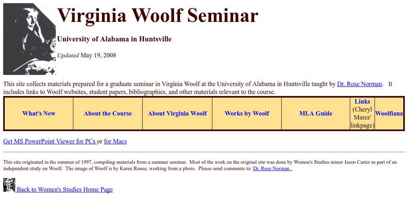 This University of Alabama site offers a wealth of material on Woolf. In addition to the customary biography, links take you to comments and analyses of several of her novels, an essay on "Men and Women" written by Woolf, and an essay on...