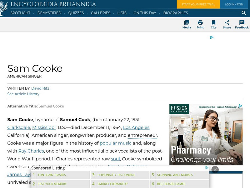 Sam Cooke's influence on music, as the pioneer in cross-over from gospel to rhythm and blues, is described in this encyclopedia entry. His music was important to the African-American identity in the Civil Rights movement.