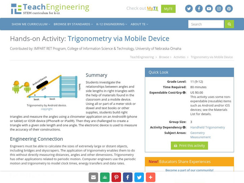Students investigate the relationships between angles and side lengths in right triangles with the help of materials found in the classroom and a mobile device.