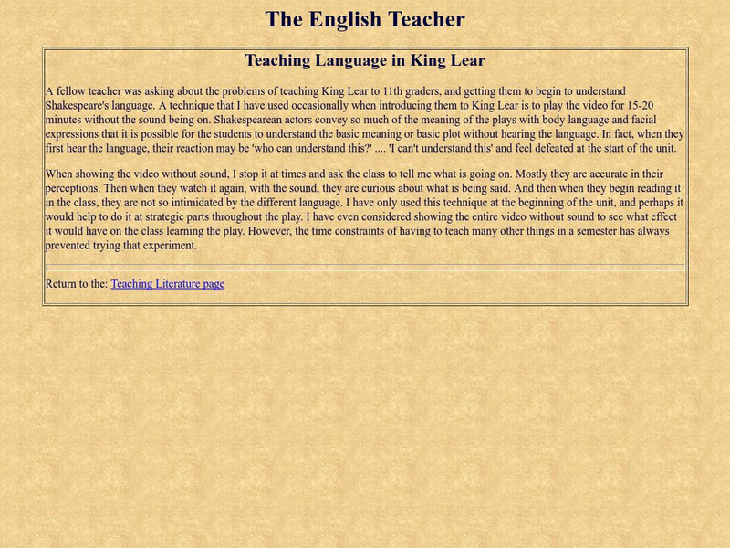 Broaden your knowledge of William Shakespeare's "King Lear," when you explore this site. This resource features links to several other educational sites with lesson plans, activities, study guides and more.