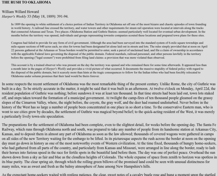 An observation printed in Harper's Weekly in 1889 about the Oklahoma land rush into the Indian Territory.