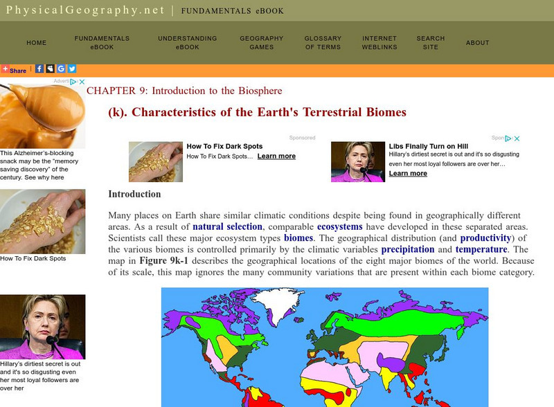 From Chapter 9 of a textbook on physical geography that covers the biosphere. Important vocabulary is highlighted and linked to a glossary. It explains the characteristics of a biome, and describes the features of the eight different...