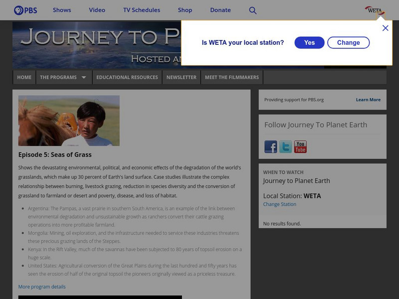 A part of the PBS series "Journey to Planet Earth," this section explores the world's grasslands, some of which are in environmental danger. Includes video and educational resources.