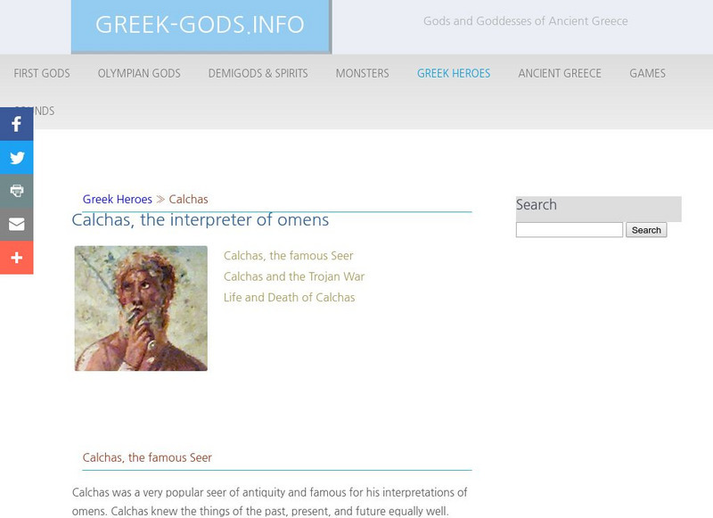 This site focuses on Calchas, ancient Greek seer famous for his interpretations of omens. It includes his ancestry, his part in the Trojan War, and his death.