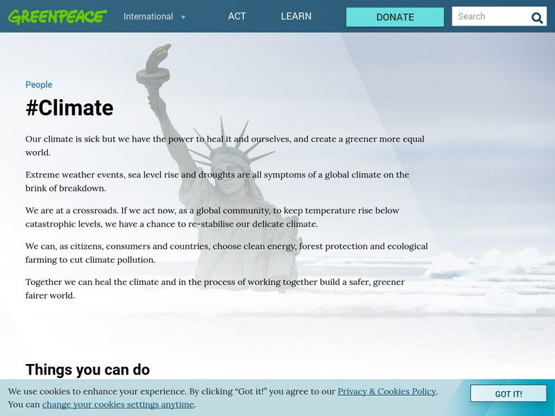 Greenpeace offers an in-depth look at climate change (or global warming). Content includes a look at the cause of climate change, the scientific evidence that supports it, the problems that occur during climate change, foreboding...