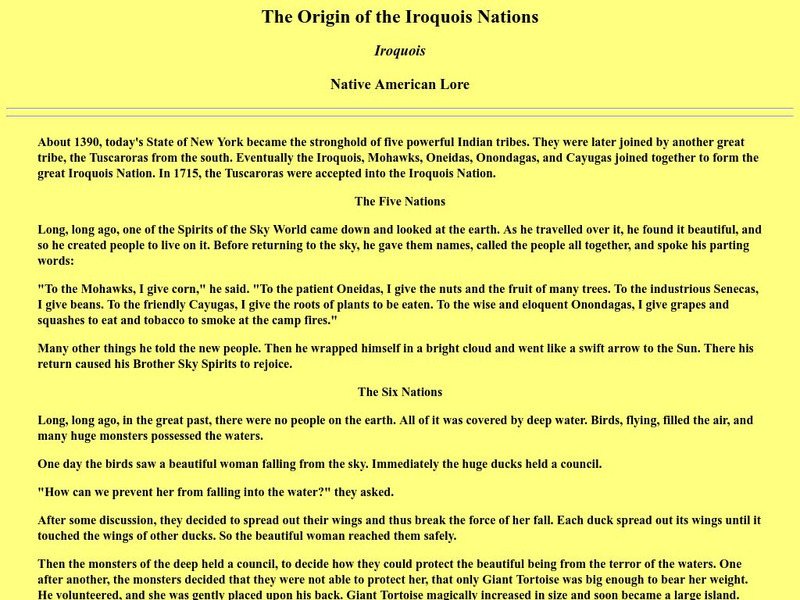 Text of Iroquois legend, "The Origin of the Iroquois Nations." Also includes brief history about the Iroquois tribes in New York.
