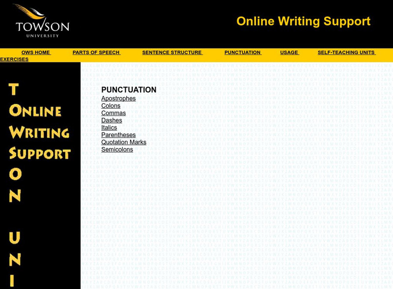 This page provides links to punctuation reference materials for apostrophes, colons, dashes, commas, parentheses, italics, quotation marks, and semicolons.