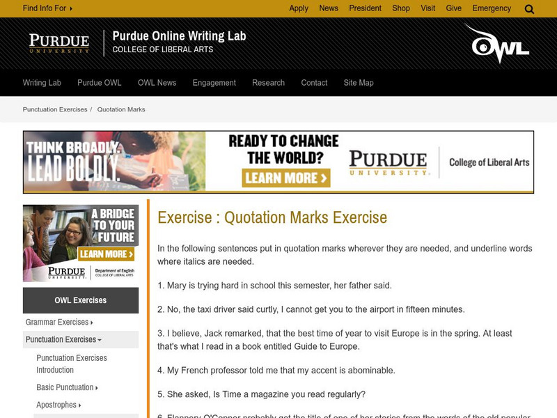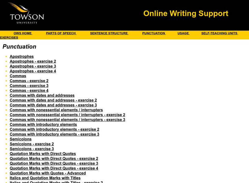 This site offers a list of links to punctuation exercises/quizzes including commas, semicolons, quotation marks, apostrophes, and italics.