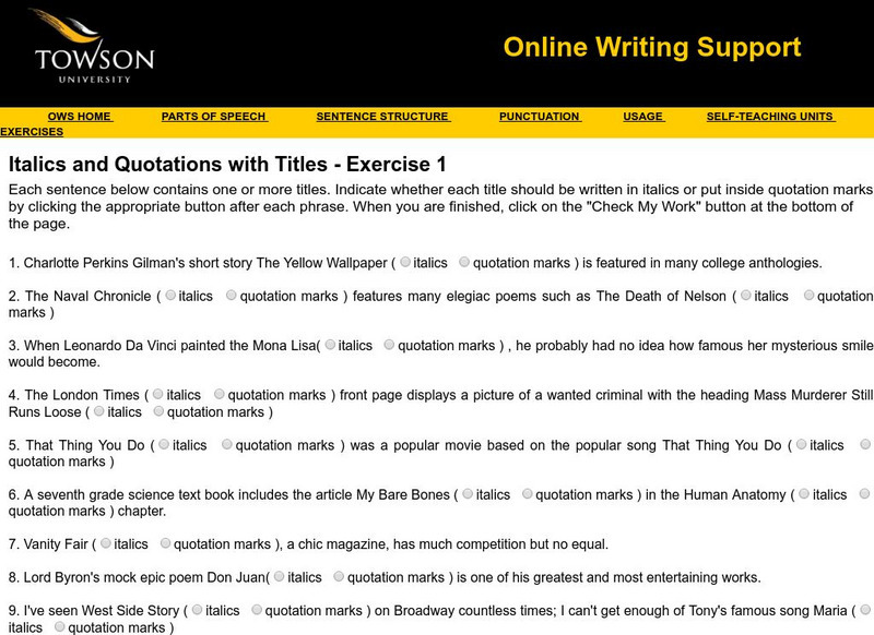 Towson University: Ows: Italics and Quotations With Titles Exercise 1