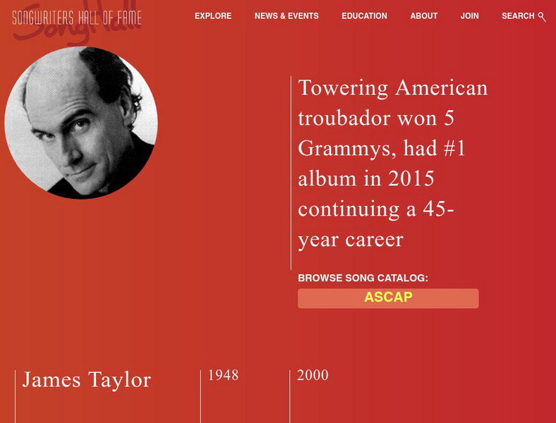Presents comprehensive biographical details on Grammy winning singer/songwriter James Taylor, a 2000 inductee into the Rock and Roll Hall of Fame. Includes a timeline of key events, essential songs, and recommended reading list.