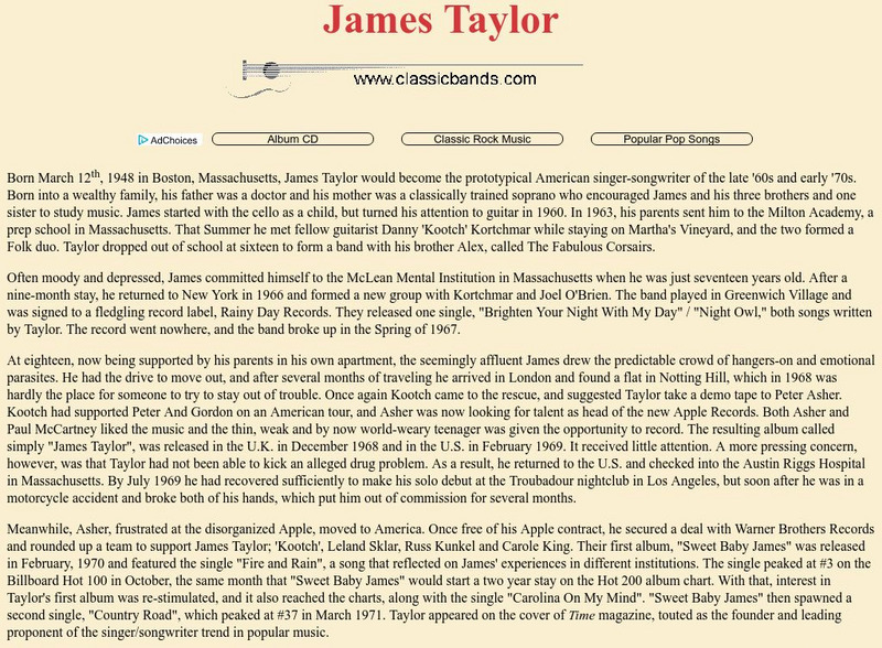 Read about the musical contributions singer-songwriter James Taylor has given to the world of rock music. This site includes a biography, discography, and an audio clip.