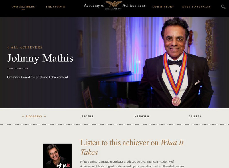 A biography of singer Johnny Mathis, an inductee into the Grammy Hall of Fame. Includes a profile, videos, and a photo gallery.