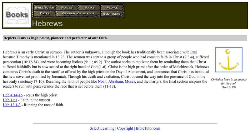 This site from The Bible Tutor provides a short, but informative introduction to the book of Hebrews that describes the message and significance of the book. Links are also provided for additional information on related subjects.