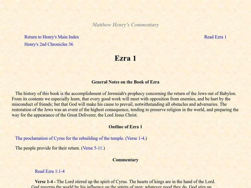 An interesting overview of the book of Ezra given by Matthew Henry that first discusses the entire book and then includes a commentary on each chapter of the book.