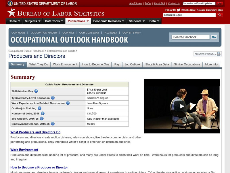 Along with information about Directors, this site evaluates the Nature of Work, Working Conditions, Employment, Training, Other Qualifications, Job Outlook, Earnings, Related Occupations, and Additional Information for Actors and Producers.