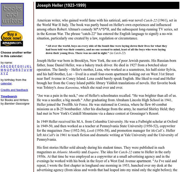 This site from the Australian Broadcasting Company provides the transcript of an interview with author Joseph Heller, who wrote Catch 22. He answers questions about his books Catch 22 and Now and Then and about his view on life. Excerpts...