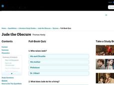 In this online interactive reading comprehension worksheet, students respond to 25 multiple choice questions about Thomas Hardy's Jude the Obscure. Students may submit their answers to be scored.