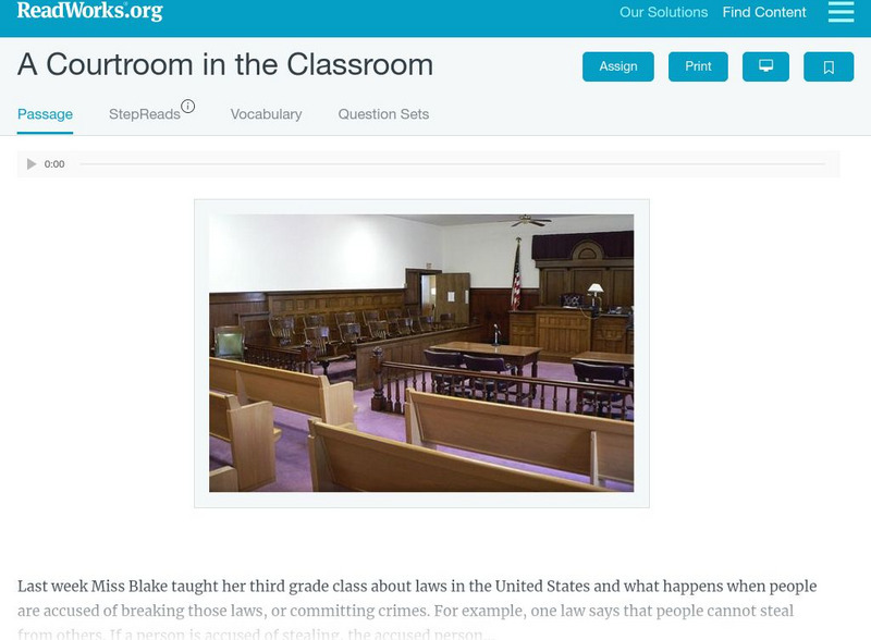 [Free Registration/Login Required] A literary text about a teacher named Miss Blake who decided to teach her students about court by creating a courtroom role-play. A question sheet is available to help students build skills in reading...