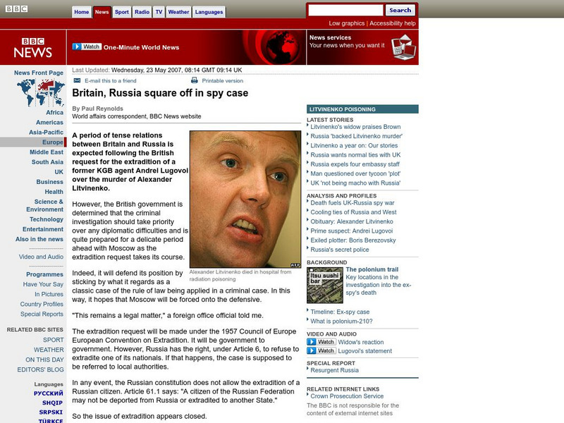 A May 2007 new report from the BBC on the smoldering dispute between British and Russian authorities over the poisoning of former KGB and agent Alexander Litvinenko and British demands for the extradition of his accused killer.