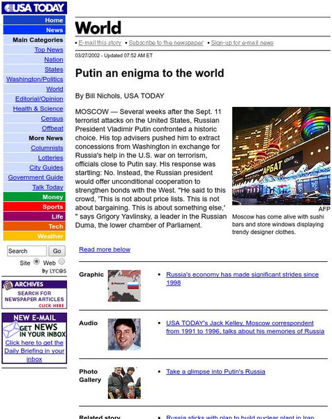 This article from 2002 looks at the reign of Vladimir Putin as head of Russia. Discusses his accomplishments and downfalls and what others have to say about his performance.