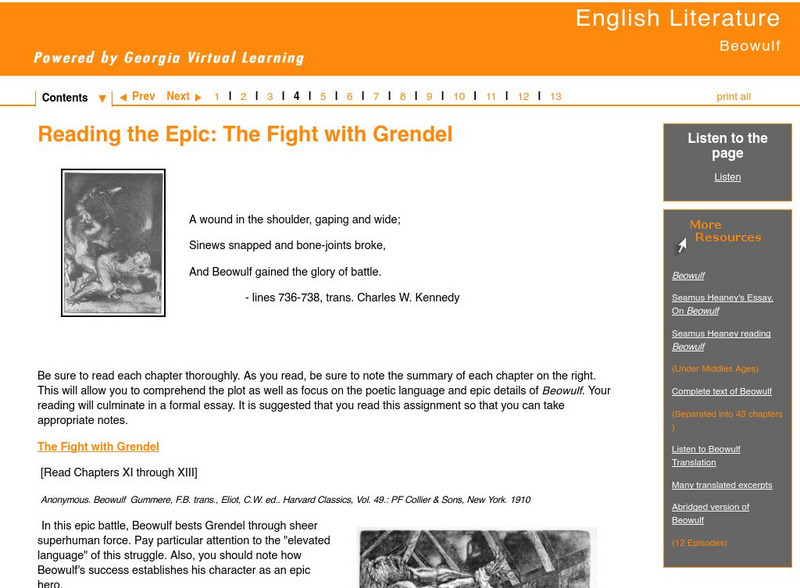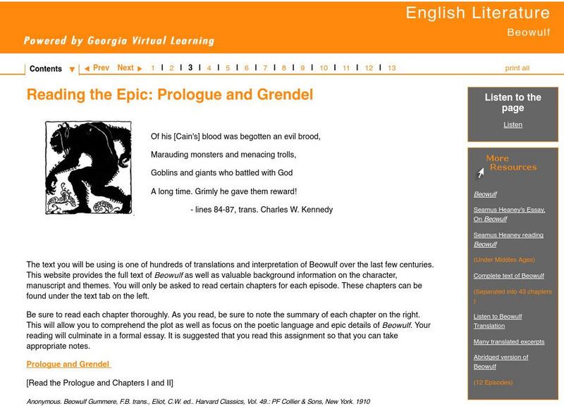 This lesson focuses on the Prologue of the epic poem Beowulf and the character Grendel, a monster of a giant race. It features links to several translations of Boewulf, cpmplete text, audio, and abridged versions. This lesson focuses on...