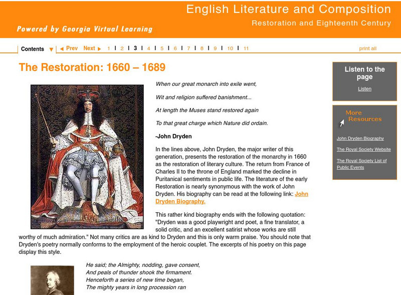 This lesson focuses on The Restoration and John Dryden and his works. It features a discussion of the period, a link to a biography of John Dryden, an example of his use of the heroic couplet, and links to "The History of the Royal...