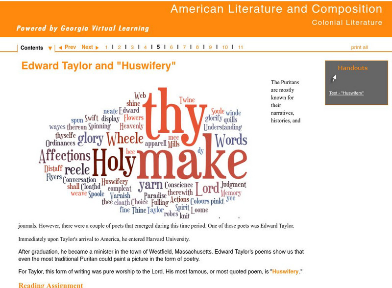 Ga Virtual Learning: Colonial Literature: Edward Taylor and "Huswifery"