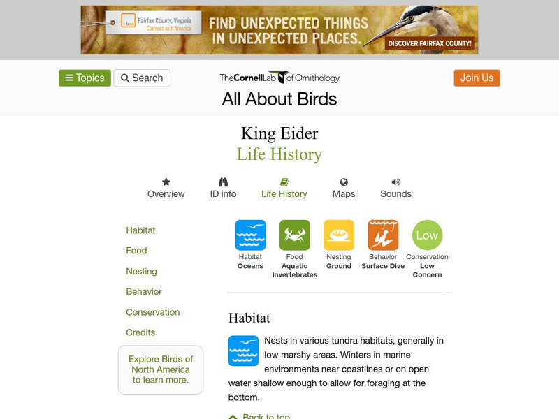 This rich site provides clear and concise facts, photos, and sounds of this spectacular looking waterfowl. A menu of topics includes: cool facts, description, range, habitat, food, behavior, reproduction, and conservation status.