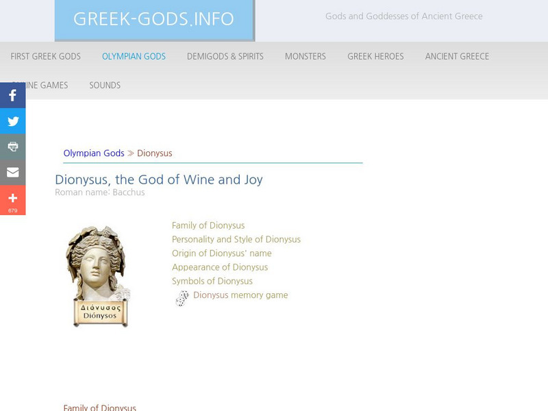 This site focuses on Dionysus, the Greek God of Wine, Joy and Theatre and a Lover of Peace. It provides 'biographical' information, background, English and Greek pronunciations of his name, other titles, pictures, myths, and his places...