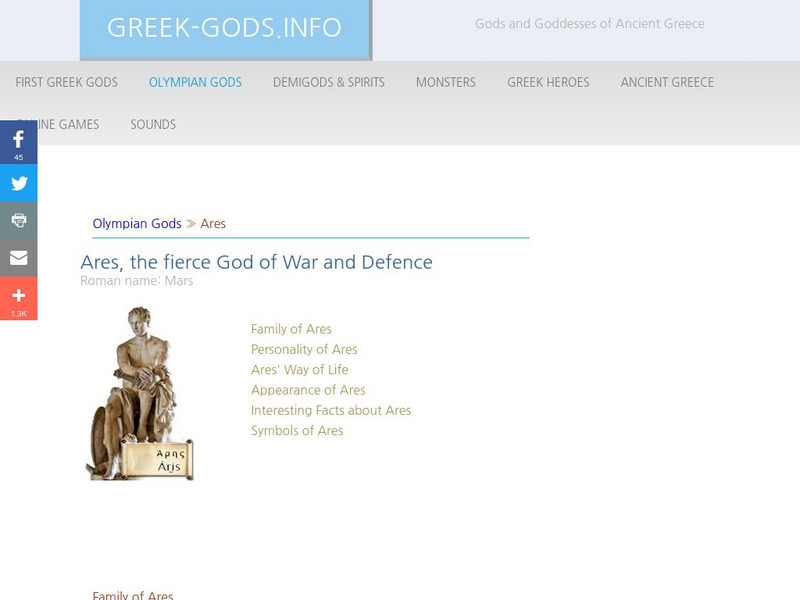 This site focuses on Ares, the Olympian god of war and defense and figure behind violence. It provides biographical information, background, English and Greek pronunciations of his name, other titles, pictures, myths, and his places of...