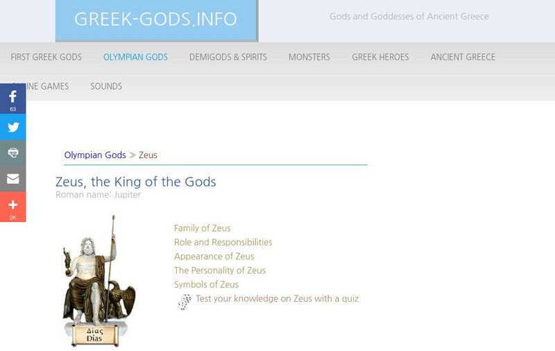 This site focuses on Zeus, the supreme god in Ancient Greece, the father of the Olympian gods, and the ruler of mankind. It provides biographical information, background, English and Greek pronunciations of his name, other titles,...