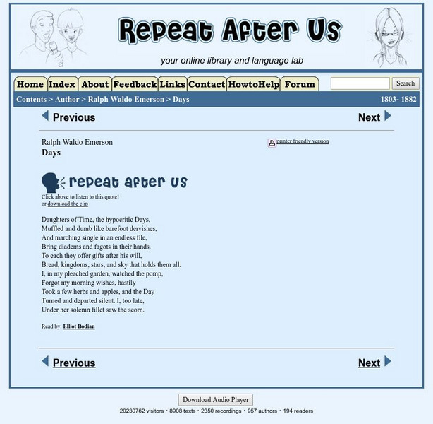 [To hear audio, use Chrome browser.] This site offers the text and audio of the poem "Days" by Ralph Waldo Emerson.