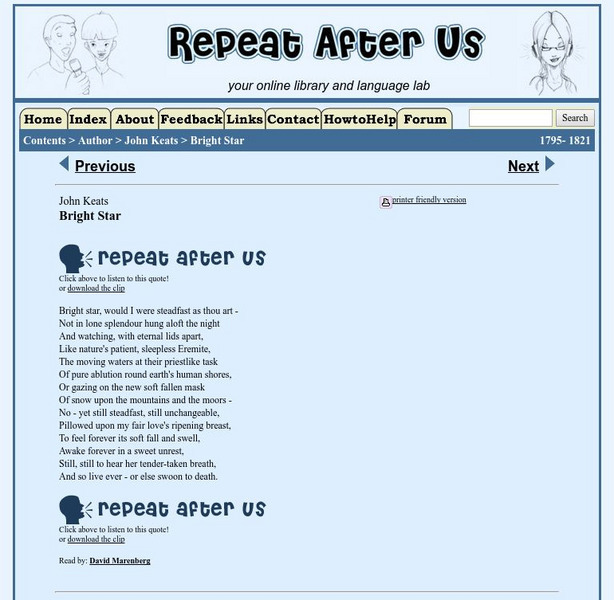 [To hear audio, use Chrome browser.] This site offers the text and audio of the poem "Bright Star" by John Keats.